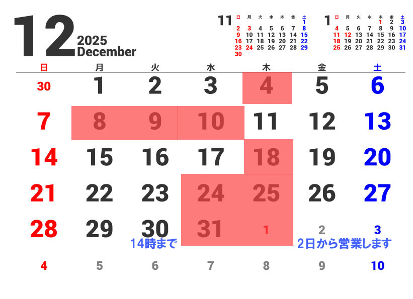 お知らせ2025年11月28日12月・年末年始営業日のお知らせ